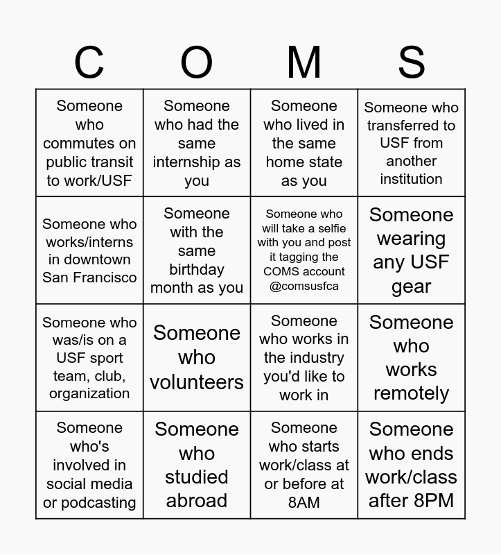 This bingo card has 16 words: Someone who studied abroad, Someone who works remotely, Someone who lived in the same home state as you, Someone who commutes on public transit to work/USF, Someone who was/is on a USF sport team, club, organization, Someone who had the same internship as you, Someone who works in the industry you'd like to work in, Someone who starts work/class at or before at 8AM, Someone who works/interns in downtown San Francisco, Someone with the same birthday month as you, Someone who's involved in social media or podcasting, Someone who transferred to USF from another institution, Someone who volunteers, Someone wearing any USF gear, Someone who will take a selfie with you and post it tagging the COMS account @comsusfca and Someone who ends work/class after 8PM.
