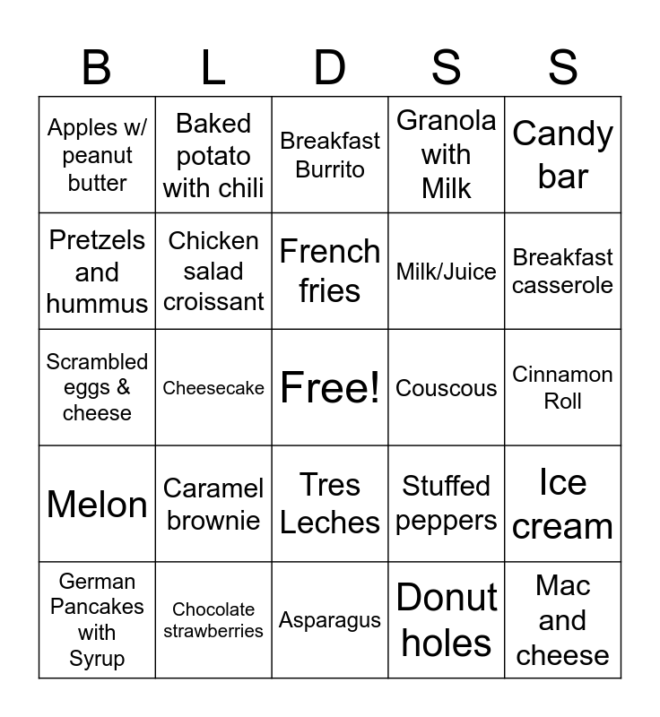 This bingo card has a free space and 29 words: German Pancakes with Syrup, Lemon garlic tilapia, Cheesecake, Breadstick, Apples w/ peanut butter, Breakfast Burrito, Chicken salad croissant, Caramel brownie, Couscous, Chocolate strawberries, Cinnamon Roll, Mac and cheese, Asparagus, Donut holes, Breakfast casserole, Pesto Pasta, Tres Leches, Melon, Candy bar, Scrambled eggs & cheese, Stuffed peppers, Strawberry shortcake, Milk/Juice, Pretzels and hummus, Granola with Milk, Baked potato with chili, Ice cream, French fries and Oreos and milk.