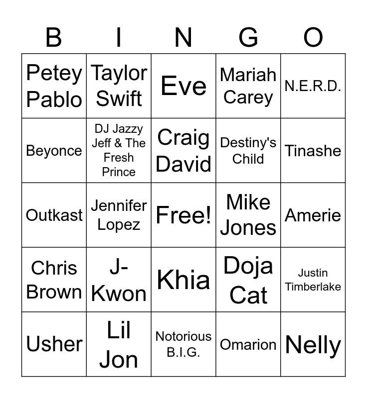 This bingo card has a free space and 38 words: Christina Aguilera, Morgan Wallen, Roddy Ricch, DJ Jazzy Jeff & The Fresh Prince, Justin Timberlake, J-Kwon, Craig David, N.O.R.E., N.E.R.D., Destiny's Child, Jennifer Lopez, Mariah Carey, Nelly, Amerie, Beyonce, Chris Brown, Ciara, Eve, Bow Wow, Mike Jones, Petey Pablo, Lil Jon, Tinashe, Usher, Too $hort, Notorious B.I.G., Kendrick Lamar, Black Eyed Peas, Dua Lipa, Meli'sa Morgan, Jack Harlow, Khia, Omarion, Taylor Swift, Sean Paul, Doja Cat, Outkast and Ja Rule.