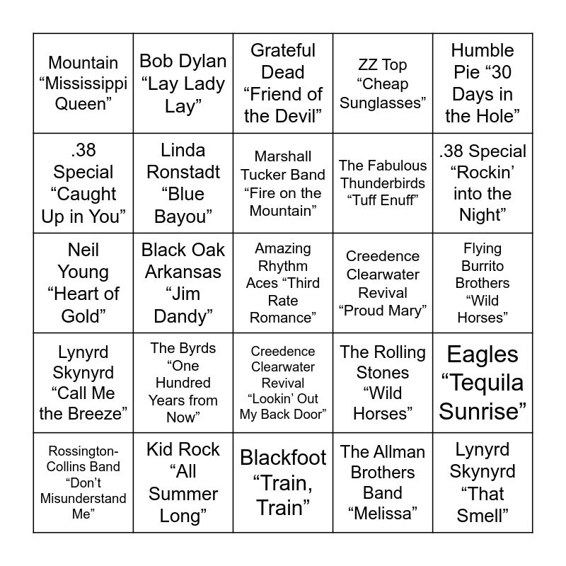 This bingo card has 25 words: The Byrds “One Hundred Years from Now”, Blackfoot “Train, Train”, Marshall Tucker Band “Fire on the Mountain”, Rossington-Collins Band “Don’t Misunderstand Me”, Humble Pie “30 Days in the Hole”, Mountain “Mississippi Queen”, .38 Special “Caught Up in You”, Bob Dylan “Lay Lady Lay”, Creedence Clearwater Revival “Proud Mary”, Creedence Clearwater Revival “Lookin’ Out My Back Door”, The Fabulous Thunderbirds “Tuff Enuff”, Neil Young “Heart of Gold”, The Rolling Stones “Wild Horses”, Eagles “Tequila Sunrise”, Linda Ronstadt “Blue Bayou”, Lynyrd Skynyrd “That Smell”, Flying Burrito Brothers “Wild Horses”, Grateful Dead “Friend of the Devil”, .38 Special “Rockin’ into the Night”, Black Oak Arkansas “Jim Dandy”, Amazing Rhythm Aces “Third Rate Romance”, Kid Rock “All Summer Long”, Lynyrd Skynyrd “Call Me the Breeze”, ZZ Top “Cheap Sunglasses” and The Allman Brothers Band “Melissa”.