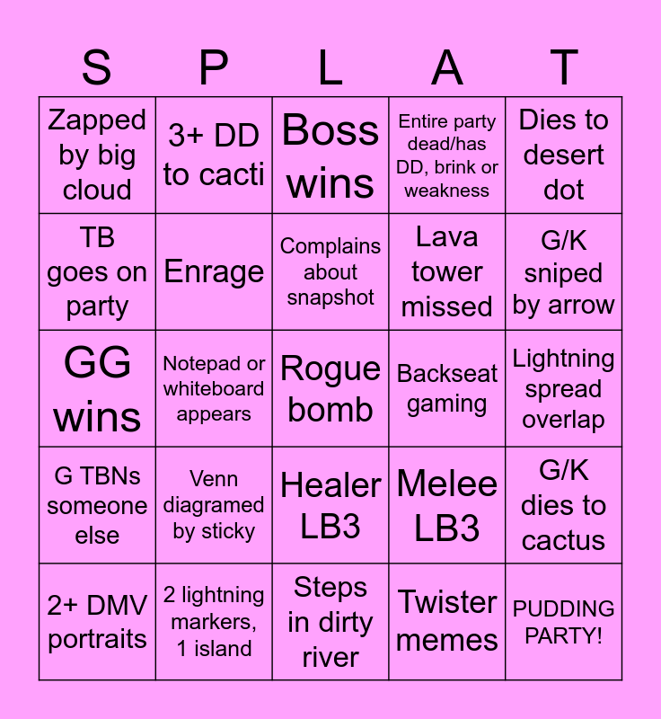 This bingo card has 35 words: Defamation explodes on party, Cringe superchat, G/K yeeted into wall, Enrage, Healer LB3, Entire party dead/has DD, brink or weakness, TB goes on party, Raised into lava, Complains about snapshot, 3 people get stickied, GG wins, Dies to desert dot, Healer dies to defamation, Tank LB3, Zapped by big cloud, Backseat gaming, Twister memes, Notepad or whiteboard appears, G TBNs someone else, Rogue bomb, Melee LB3, 2+ DMV portraits, G/K dies to cactus, 2 lightning markers, 1 island, Boss wins, G/K sniped by arrow, PUDDING PARTY!, Drowns in quicksand, Lava tower missed, Lightning spread overlap, Dies from full HP, Steps in dirty river, Venn diagramed by sticky, 3+ DD to cacti and G eats wrong buster.