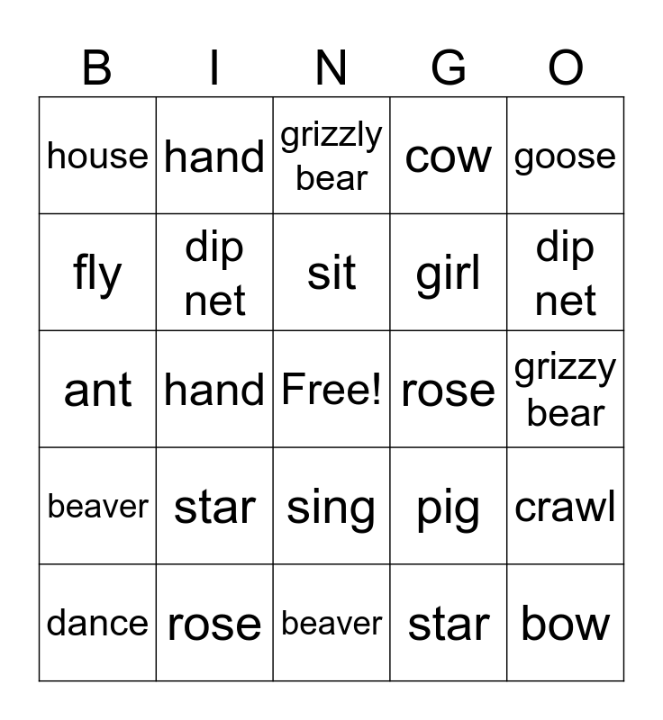 This bingo card has a free space and 39 words: fly, cry, girl, dip net, dance, sing, sit, river, goose, beaver, hand, cow, bow, grizzy bear, rose, star, cry, house, store, pig, fly, beaver, girl, dip net, dance, sing, sit, river, goose, hand, cow, bow, grizzly bear, rose, star, fern, crawl, ant and walking.