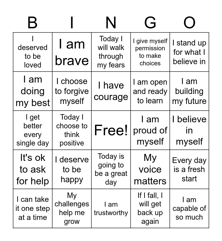 This bingo card has a free space and 40 words: I am enough, I get better every single day, I am an amazing human, I choose to forgive myself, My challenges help me grow, Today is going to be a great day, I have courage, I am confident, I stand up for what I believe in, It's ok to ask for help, Today I choose to think positive, I give myself permission to make choices, I am capable of so much, I believe in myself, I am proud of myself, I deserve to be happy, I can make a difference, I deserved to be loved, Good things are going to come to me, Today I will walk through my fears, Every day is a fresh start, If I fall, I will get back up again, I am open and ready to learn, I am doing my best, I accept who I am, It's ok to make mistakes, I surround myself with positive people, I am strong, I can live in the moment, With every breath I feel stronger, I am kind, I can take it one step at a time, I am working on myself, My voice matters, I am building my future, I am trustworthy, I am smart, I am resilient, I am brave and I am worth it.