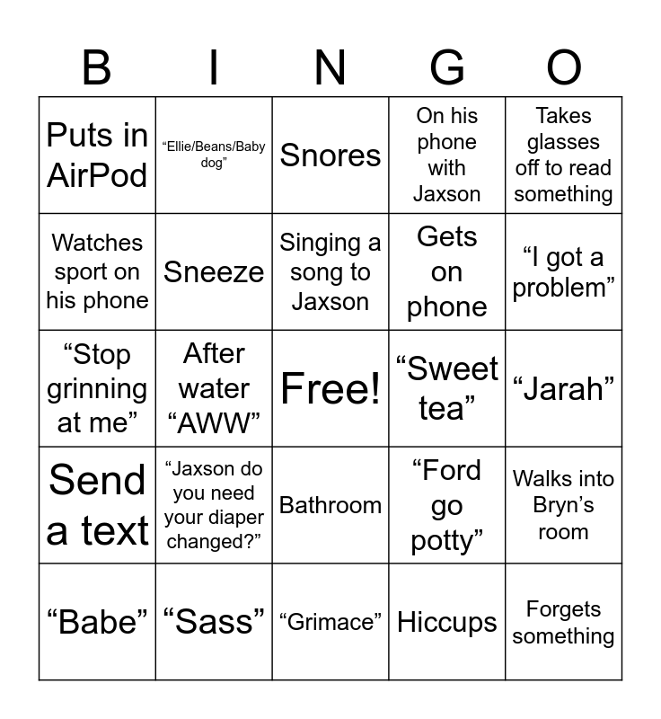 This bingo card has a free space and 24 words: “Jaxson do you need your diaper changed?”, “Sass”, Singing a song to Jaxson, “Babe”, Takes glasses off to read something, Puts in AirPod, Watches sport on his phone, “Ellie/Beans/Baby dog”, “Sweet tea”, Bathroom, Gets on phone, “Stop grinning at me”, “Ford go potty”, Walks into Bryn’s room, Sneeze, Hiccups, “Jarah”, Snores, “I got a problem”, After water “AWW”, Forgets something, Send a text, On his phone with Jaxson and “Grimace”.