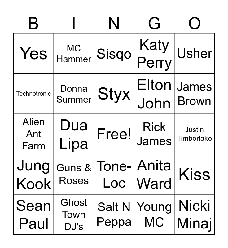 This bingo card has a free space and 37 words: Bon Jovi, Michael Jackson, Cheryl Lynn, Donna Summer, Kiss, Guns & Roses, Styx, Chappell Roan, Usher, Sabrina Carpenter, Dua Lipa, Katy Perry, Nicki Minaj, Justin Timberlake, Technotronic, Jung Kook, Black Eyed Peas, Sisqo, Tone-Loc, Rick James, Yes, James Brown, Sean Paul, Salt N Peppa, Rob Base & DJ EZ Rock, Young MC, MC Hammer, Flo Rida, Rihanna, Gap Band, MAC Band, Ghost Town DJ's, Alien Ant Farm, Mick Jagger, Anita Ward, Elton John and Shalamar.