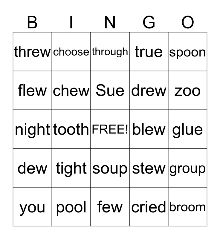 This bingo card has a free space and 24 words: tight, pool, Sue, you, spoon, threw, flew, choose, blew, soup, drew, night, stew, group, chew, cried, glue, through, zoo, tooth, broom, dew, true and few.