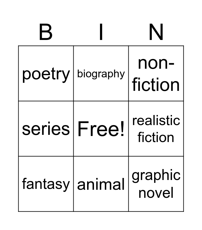 This bingo card has a free space and 8 words: realistic fiction, non-fiction, biography, fantasy, poetry, graphic novel, series and animal.