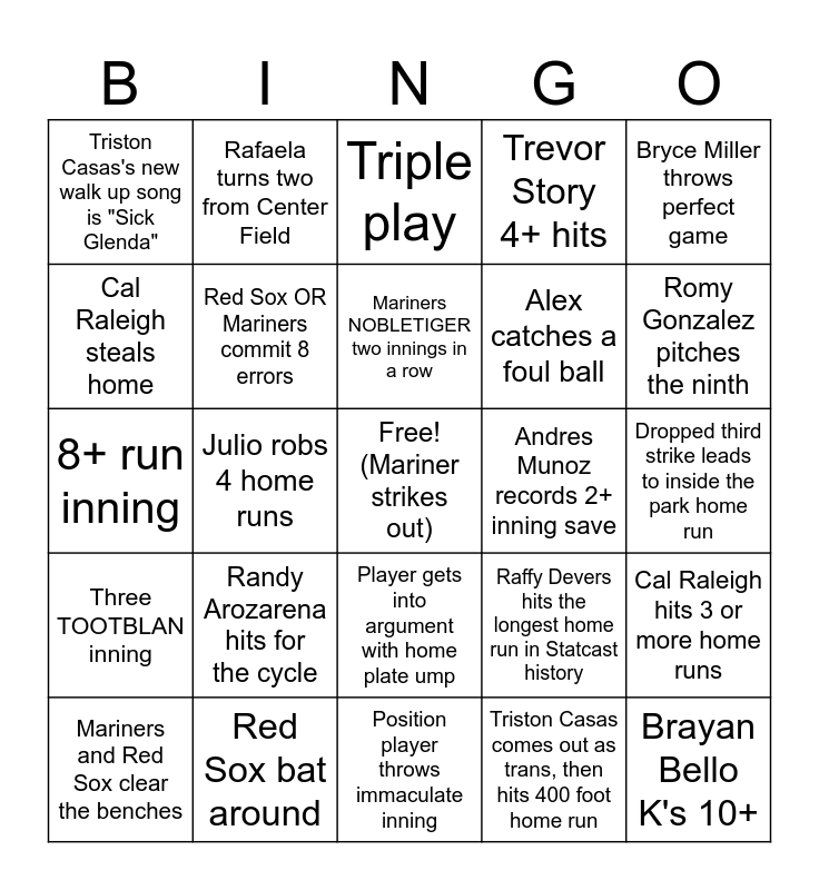 This bingo card has a free space and 24 words: Randy Arozarena hits for the cycle, Red Sox bat around, Mariners NOBLETIGER two innings in a row, Mariners and Red Sox clear the benches, Bryce Miller throws perfect game, Triston Casas's new walk up song is "Sick Glenda", Cal Raleigh steals home, Rafaela turns two from Center Field, Andres Munoz records 2+ inning save, Player gets into argument with home plate ump, Alex catches a foul ball, 8+ run inning, Raffy Devers hits the longest home run in Statcast history, Cal Raleigh hits 3 or more home runs, Red Sox OR Mariners commit 8 errors, Triston Casas comes out as trans, then hits 400 foot home run, Dropped third strike leads to inside the park home run, Triple play, Romy Gonzalez pitches the ninth, Julio robs 4 home runs, Brayan Bello K's 10+, Three TOOTBLAN inning, Trevor Story 4+ hits and Position player throws immaculate inning.