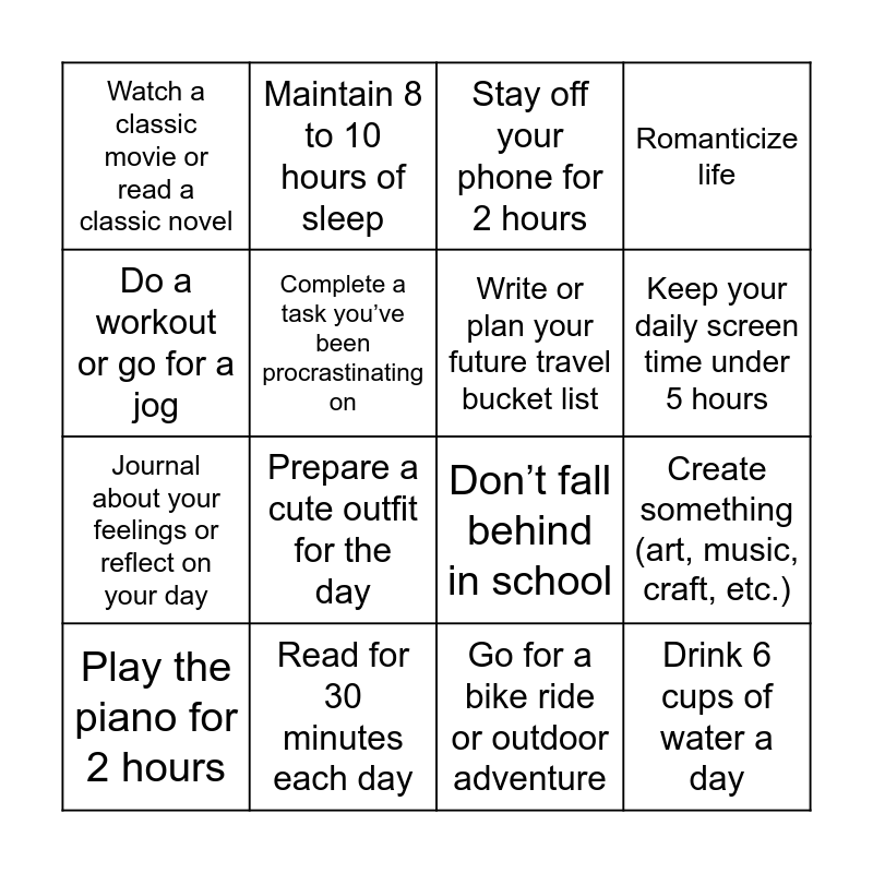 This bingo card has 16 words: Read for 30 minutes each day, Create something (art, music, craft, etc.), Stay off your phone for 2 hours, Watch a classic movie or read a classic novel, Journal about your feelings or reflect on your day, Maintain 8 to 10 hours of sleep, Don’t fall behind in school, Go for a bike ride or outdoor adventure, Do a workout or go for a jog, Complete a task you’ve been procrastinating on, Play the piano for 2 hours, Romanticize life, Prepare a cute outfit for the day, Keep your daily screen time under 5 hours, Write or plan your future travel bucket list and Drink 6 cups of water a day.