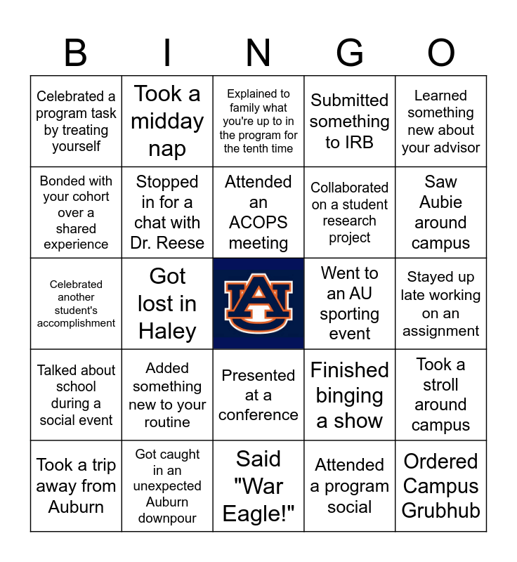 This bingo card has a free space and 30 words: Got caught in an unexpected Auburn downpour, Tried to find parking downtown on a game weekend, Got lost in Haley, Participated in an Auburn tradition, Celebrated a program task by treating yourself, Explained to family what you're up to in the program for the tenth time, Stopped in for a chat with Dr. Reese, Presented at a conference, Went to an AU sporting event, Said "War Eagle!", Stayed up late working on an assignment, Ordered Campus Grubhub, Attended a program social, Tried a new restaurant in Auburn/Opelika, Saw Aubie around campus, Made a new friend, Finished binging a show, Talked about school during a social event, Added something new to your routine, Learned something new about your advisor, Celebrated another student's accomplishment, Had a study date with a program member, Took a midday nap, Collaborated on a student research project, Bonded with your cohort over a shared experience, Submitted something to IRB, Took a stroll around campus, Took a trip away from Auburn, Attended an ACOPS meeting and Spent a night in RDB Library.