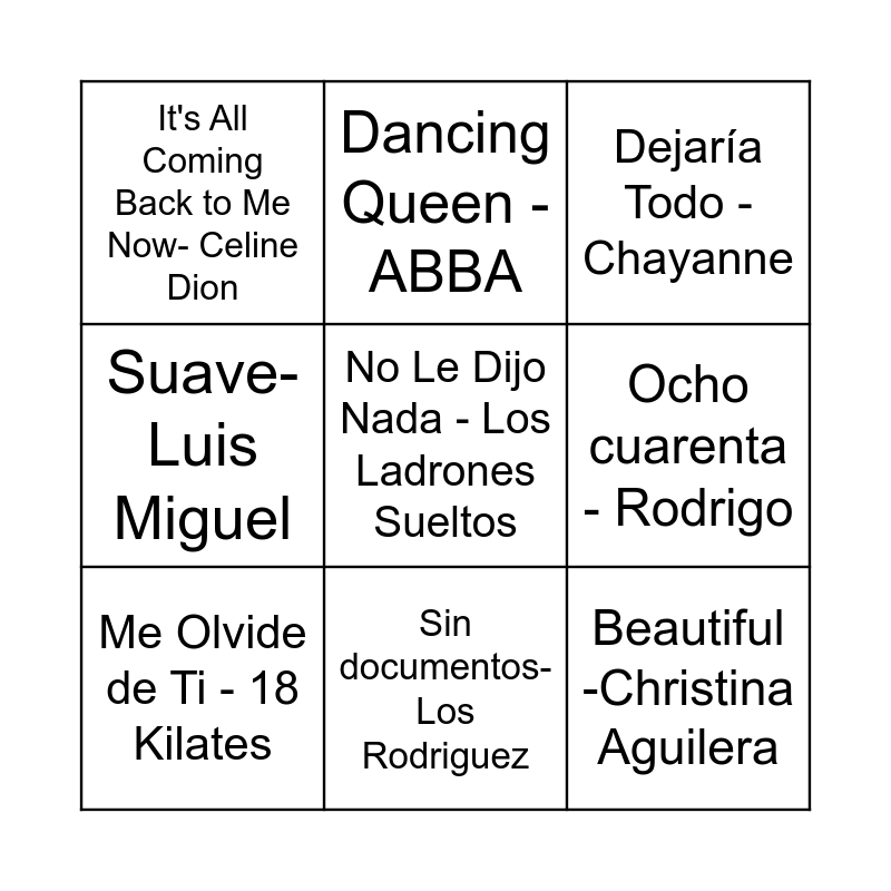 This bingo card has 64 words: Free!, Wanna Dance with Somebody .Whitney Houston, Africa- TOTO, Baby One More - Time Britney Spears, El amor después del amor - Fito Paez, All I Want for Christmas Is You - Mariah Carey, Dancing Queen - ABBA, Mariposa tecknicolor - Fito Paez, Sin documentos- Los Rodriguez, Auto rojo - Vilma Palma e Vampiros, La Rubia del Avión, Nada Es Igual- La Portuaria, Mary Poppins y el deshollinador, No Le Dijo Nada - Los Ladrones Sueltos, Runaway - Los Pericos, Ocho cuarenta - Rodrigo, Me Late - Los Pericos, It's All Coming Back to Me Now- Celine Dion, Avril Lavigne -My Happy Ending, Beautiful -Christina Aguilera, Bye Bye Bye -*NICVNA, No Podrás - Cristian Castro, Suave- Luis Miguel, Where Is The Love?- . Black Eyed Peas, Corazón partío -Alejandro Sanz, Entra en Mi Vida -Sin Bandera, Wannabe -Spice Girls, Maldita Noche - Bandana, Si Te Vas - Shakira, Lloviendo Estrellas- Cristian Castro, A Veces - Mambru, Cuesta Arriba, Cuesta Abajo -Natalia Oreiro, Quiero tener tu presencia - Seguridad Social, Amor Narcótico - ChiChi Peralta, Jandy Feliz, Los Dueños de Pabellon - Damas Gratis, Amores Como el Nuestro- Los Charros, Agüita - Rafaga, Pibe Cantina - Yerba Brava, La Ventanita - Grupo Sombras, Me Olvide de Ti - 18 Kilates, A Don Ata- Soledad, Take on Me - . a-ha, I Gotta Feeling - . Black Eyed Peas, Llamado de Emergencia- Daddy Yankee, Por lo que yo te quiero - Walter Olmos, Limbo - Daddy Yankee, Virtual Diva- Don Omar, Oops !... I Did It Again - Britney Spears, Obsesion - Aventura, Judy Santos, Everybody Get Up - Radio Edit - Five, Bar - tini, Amigos Con Derecho- Nene Malo, La Triple T -TINI, El Problema - Ricardo Arjona, Minutos- Ricardo Arjona, Un Siglo Sin Ti- Chayanne, Dejaría Todo - Chayanne, Deja De Llorar - El Polaco, Don- Miranda!, Te Quiero Tanto, No Me Preguntes Más- Sergio Denis, Soy Sabalero - Los Palmeras, Marítima - Delfina Arroyo, Multifacética - Delfina Arroyo and Jardines - Delfina Arroyo.