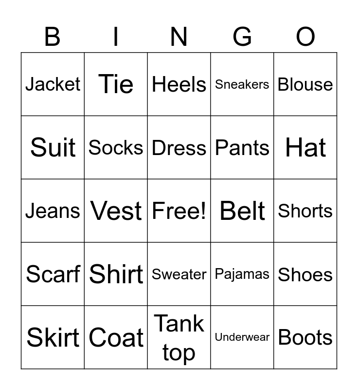 This bingo card has a free space and 24 words: Shirt, Coat, Dress, Skirt, Blouse, Jacket, Suit, Tie, Belt, Sweater, Pants, Jeans, Pajamas, Shoes, Socks, Underwear, Shorts, Heels, Hat, Vest, Boots, Scarf, Sneakers and Tank top.