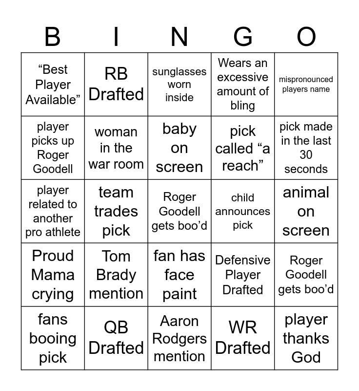 This bingo card has a free space and 25 words: Tom Brady mention, Aaron Rodgers mention, baby on screen, fans booing pick, mispronounced players name, “Best Player Available”, player picks up Roger Goodell, RB Drafted, child announces pick, fan has face paint, pick called “a reach”, player related to another pro athlete, Defensive Player Drafted, Roger Goodell gets boo’d, woman in the war room, non-football celebrity, animal on screen, sunglasses worn inside, pick made in the last 30 seconds, team trades pick, player thanks God, QB Drafted, Proud Mama crying, Wears an excessive amount of bling and WR Drafted.
