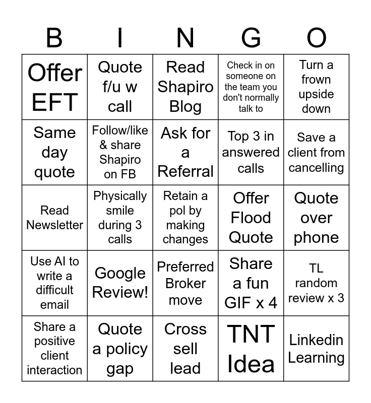 This bingo card has 25 words: Google Review!, Cross sell lead, Ask for a Referral, Share a positive client interaction, Turn a frown upside down, Offer EFT, Same day quote, Quote f/u w call, Offer Flood Quote, Preferred Broker move, Top 3 in answered calls, Read Newsletter, Share a fun GIF x 4, TL random review x 3, Follow/like & share Shapiro on FB, Linkedin Learning, Quote over phone, Read Shapiro Blog, Save a client from cancelling, Physically smile during 3 calls, Retain a pol by making changes, Quote a policy gap, Use AI to write a difficult email, Check in on someone on the team you don't normally talk to and TNT Idea.