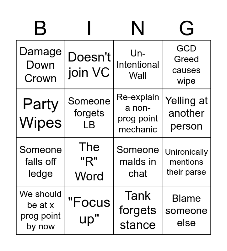This bingo card has 16 words: "Focus up", Unironically mentions their parse, Un-Intentional Wall, Damage Down Crown, Someone falls off ledge, Doesn't join VC, Someone malds in chat, Tank forgets stance, Party Wipes, Someone forgets LB, We should be at x prog point by now, GCD Greed causes wipe, The "R" Word, Yelling at another person, Re-explain a non-prog point mechanic and Blame someone else.