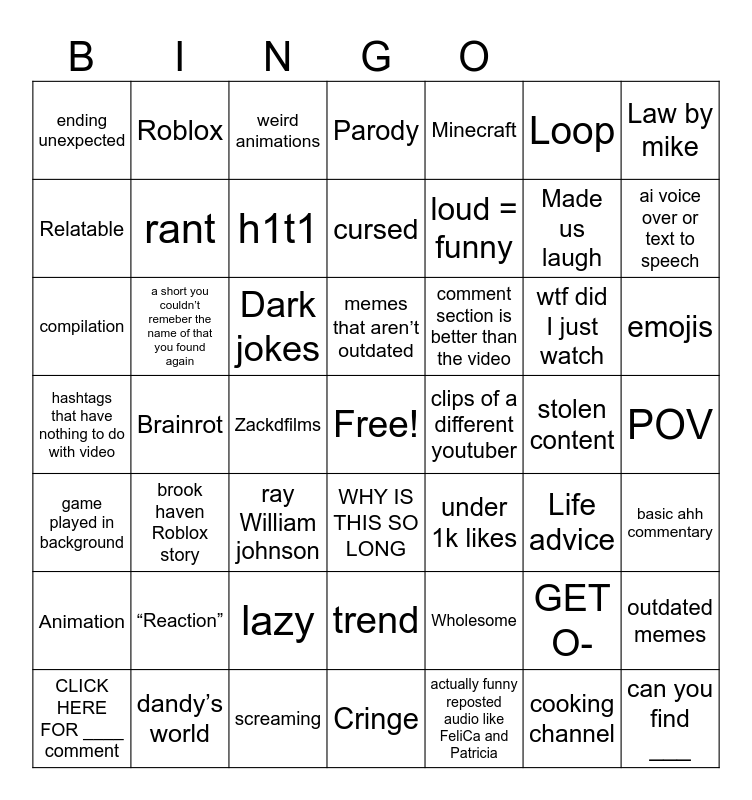 This bingo card has a free space and 48 words: Wholesome, Made us laugh, Cringe, Brainrot, Dark jokes, POV, Roblox, dandy’s world, Loop, WHY IS THIS SO LONG, Law by mike, Parody, wtf did I just watch, comment section is better than the video, Animation, stolen content, Relatable, ai voice over or text to speech, GET O-, Minecraft, loud = funny, Zackdfilms, ending unexpected, rant, outdated memes, h1t1, emojis, CLICK HERE FOR ____ comment, memes that aren’t outdated, a short you couldn’t remeber the name of that you found again, cooking channel, clips of a different youtuber, basic ahh commentary, “Reaction”, hashtags that have nothing to do with video, under 1k likes, Life advice, compilation, ray William johnson, lazy, game played in background, can you find ___, weird animations, screaming, cursed, trend, brook haven Roblox story and actually funny reposted audio like FeliCa and Patricia.