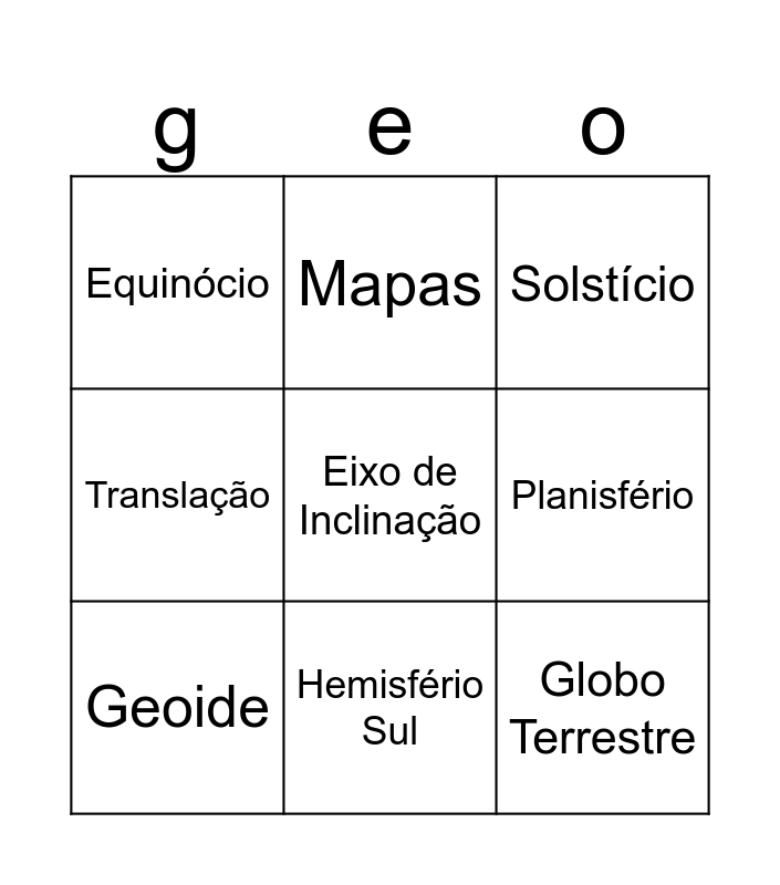 This bingo card has 9 words: Geoide, Solstício, Mapas, Translação, Equinócio, Planisfério, Eixo de Inclinação, Globo Terrestre and Hemisfério Sul.