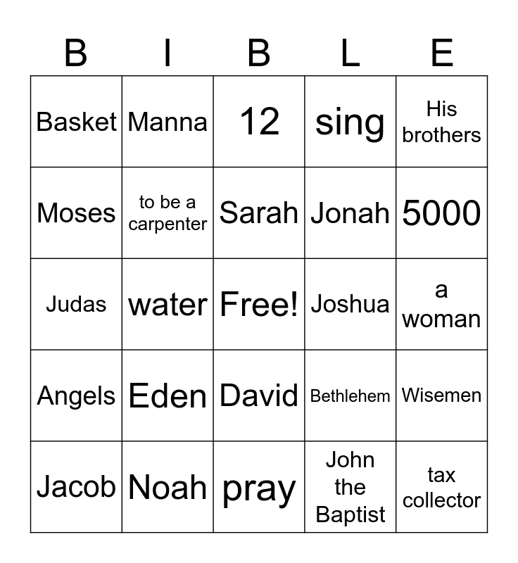 This bingo card has a free space and 24 words: Eden, Noah, Sarah, Jacob, His brothers, Basket, Moses, Manna, Joshua, David, Jonah, Judas, Bethlehem, Wisemen, to be a carpenter, John the Baptist, a woman, 12, 5000, water, tax collector, Angels, sing and pray.