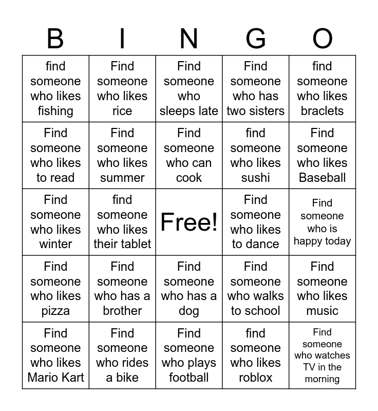 This bingo card has a free space and 47 words: Find someone who lives near school, Find someone who watches TV in the morning, Find someone who is happy today, Find someone who plays football, Find someone who has a brother, find someone who likes traveling, Find someone who likes rice, find someone who likes video games, Find someone who likes to read, Find someone who wears black shoes, Find someone who likes summer, Find someone who has two sisters, Find someone who likes music, Find someone who walks to school, Find someone who can swim, Find someone who likes chicken, Find someone who can cook, Find someone who likes to dance, Find someone who sleeps late, find someone who likes braclets, find someone who likes their tablet, find someone who likes roblox, find someone who likes fishing, find someone who likes sushi, Find someone who plays an instrument, Find someone who likes Baseball, Find someone who likes Mario Kart, Find someone who like Pokémon, Find someone who has a dog, Find someone who likes pizza, Find someone who plays soccer, Find someone who wakes up early, Find someone who is wearing blue, Find someone who can swim, Find someone who likes music, Find someone who rides a bike, Find someone who is happy today, Find someone who wants to sleep, Find someone who drinks tea, Find someone who likes sports, Find someone who likes to dance, Find someone who sleeps late, Find someone who likes winter, Find someone who likes ice cream, Find someone who has a phone, Find someone who walks to school and Find someone who wears glasses..
