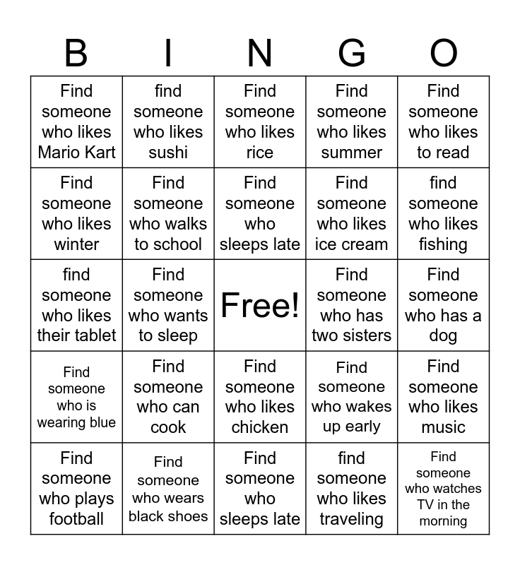 This bingo card has a free space and 44 words: Find someone who lives near school, Find someone who watches TV in the morning, Find someone who is happy today, Find someone who plays football, Find someone who has a brother, find someone who likes traveling, Find someone who likes rice, find someone who likes video games, Find someone who likes to read, Find someone who wears black shoes, Find someone who likes summer, Find someone who has two sisters, Find someone who likes chicken, Find someone who can cook, Find someone who likes to dance, Find someone who sleeps late, find someone who likes braclets, find someone who likes their tablet, find someone who likes roblox, find someone who likes fishing, find someone who likes sushi, Find someone who plays an instrument, Find someone who likes Baseball, Find someone who likes Mario Kart, Find someone who like Pokémon, Find someone who has a dog, Find someone who likes pizza, Find someone who plays soccer, Find someone who wakes up early, Find someone who is wearing blue, Find someone who can swim, Find someone who likes music, Find someone who rides a bike, Find someone who is happy today, Find someone who wants to sleep, Find someone who drinks tea, Find someone who likes sports, Find someone who likes to dance, Find someone who sleeps late, Find someone who likes winter, Find someone who likes ice cream, Find someone who has a phone, Find someone who walks to school and Find someone who wears glasses..