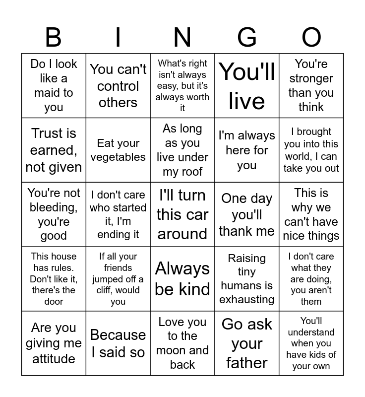 This bingo card has a free space and 27 words: Raising tiny humans is exhausting, Alexa, parent the kids, I'm always here for you, Love you to the moon and back, Trust is earned, not given, What's right isn't always easy, but it's always worth it, You can't control others, This house has rules. Don't like it, there's the door, One day you'll thank me, I don't care what they are doing, you aren't them, You're not bleeding, you're good, You'll live, Are you giving me attitude, Because I said so, I brought you into this world, I can take you out, Money doesn't grow on trees, Eat your vegetables, As long as you live under my roof, If all your friends jumped off a cliff, would you, Do I look like a maid to you, This is why we can't have nice things, Go ask your father, I don't care who started it, I'm ending it, You'll understand when you have kids of your own, Always be kind, You're stronger than you think and You don't have to be perfect, just do your best.