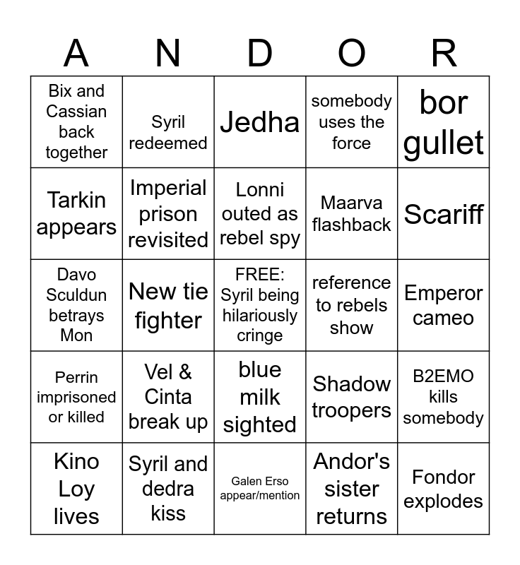 This bingo card has a free space and 28 words: B2EMO kills somebody, Vader appears, Maarva flashback, Andor's sister returns, Tarkin appears, Jedha, Syril redeemed, Perrin imprisoned or killed, reference to rebels show, Kino Loy lives, Davo Sculdun betrays Mon, somebody uses the force, Syril and dedra kiss, Galen Erso appear/mention, Scariff, Syril dumps out his cereal, Vel & Cinta break up, Imperial prison revisited, Lonni outed as rebel spy, blue milk sighted, Bix and Cassian back together, Luthen sacrifices another ally, Fondor explodes, New tie fighter, Emperor cameo, Shadow troopers, bor gullet and Imperial doubts the empire.