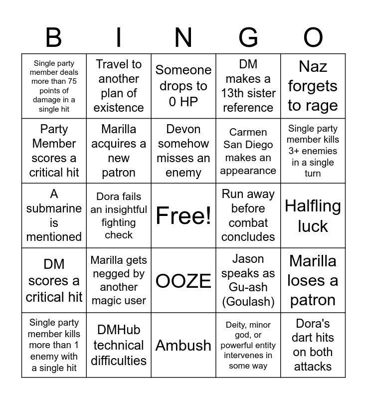 This bingo card has a free space and 37 words: Party member dies, Wild Magic Surge, Eldritch Blast, Marilla acquires a new patron, Marilla loses a patron, Marilla gets negged by another magic user, Devon somehow misses an enemy, RAGE, Naz forgets to rage, Naz suggests the party retreat within the first two rounds of combat, Dora fails an insightful fighting check, DM makes a 13th sister reference, Dora's dart hits on both attacks, Halfling luck, Party Member scores a critical hit, DM scores a critical hit, TPK, Someone drops to 0 HP, OOZE, Run away before combat concludes, Single party member deals more than 75 points of damage in a single hit, Single party member kills 3+ enemies in a single turn, Single party member kills more than 1 enemy with a single hit, Ambush, Ye Fuckers murder someone in cold blood, Deity, minor god, or powerful entity intervenes in some way, Travel to another plan of existence, An ally dies, Ye Fuckers defeat a Big Bad, The entire party in disguises, Fashion moment/montage, DMHub technical difficulties, A submarine is mentioned, Anyone puts on a snake skin jacket, Jason speaks as Gu-ash (Goulash), Carmen San Diego makes an appearance and Bailey Glovehammer makes an appearance.