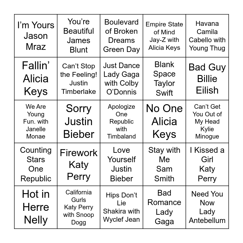 This bingo card has 25 words: Firework Katy Perry, Hips Don’t Lie Shakira with Wyclef Jean, Just Dance Lady Gaga with Colby O’Donnis, Hot in Herre Nelly, Havana Camila Cabello with Young Thug, I’m Yours Jason Mraz, Fallin’ Alicia Keys, You’re Beautiful James Blunt, No One Alicia Keys, Love Yourself Justin Bieber, Blank Space Taylor Swift, We Are Young Fun. with Janelle Monae, Stay with Me Sam Smith, I Kissed a Girl Katy Perry, Can’t Stop the Feeling! Justin Timberlake, Need You Now Lady Antebellum, Can’t Get You Out of My Head Kylie Minogue, Boulevard of Broken Dreams Green Day, Bad Guy Billie Eilish, Sorry Justin Bieber, Apologize One Republic with Timbaland, California Gurls Katy Perry with Snoop Dogg, Counting Stars One Republic, Empire State of Mind Jay-Z with Alicia Keys and Bad Romance Lady Gaga.