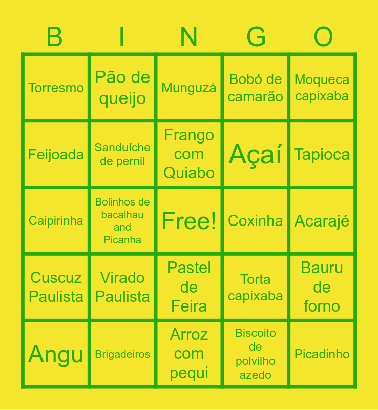 This bingo card has a free space and 24 words: Virado Paulista, Brigadeiros, Frango com Quiabo, Angu, Moqueca capixaba, Torresmo, Feijoada, Pão de queijo, Coxinha, Pastel de Feira, Açaí, Caipirinha, Torta capixaba, Bauru de forno, Sanduíche de pernil, Biscoito de polvilho azedo, Acarajé, Munguzá, Tapioca, Bolinhos de bacalhau and Picanha, Picadinho, Cuscuz Paulista, Bobó de camarão and Arroz com pequi.