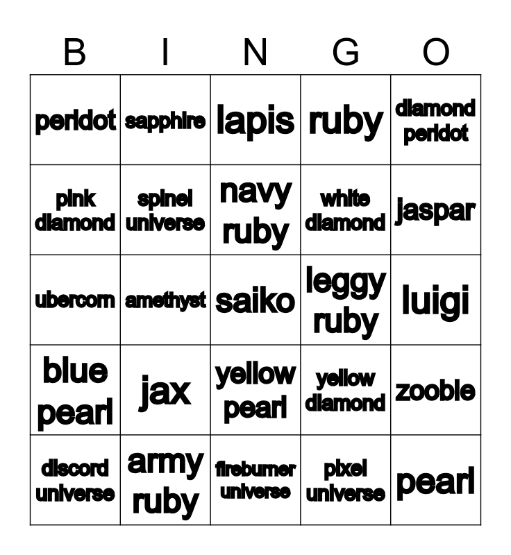 This bingo card has 29 words: discord universe, garnet, amethyst, pearl, peridot, lapis, spinel universe, jax, leggy ruby, army ruby, luigi, saiko, fireburner universe, pixel universe, jaspar, diamond amethyst, yellow pearl, blue pearl, diamond peridot, ubercorn, yellow diamond, blue diamond, white diamond, pink diamond, ruby, sapphire, zooble, navy ruby and doc ruby.