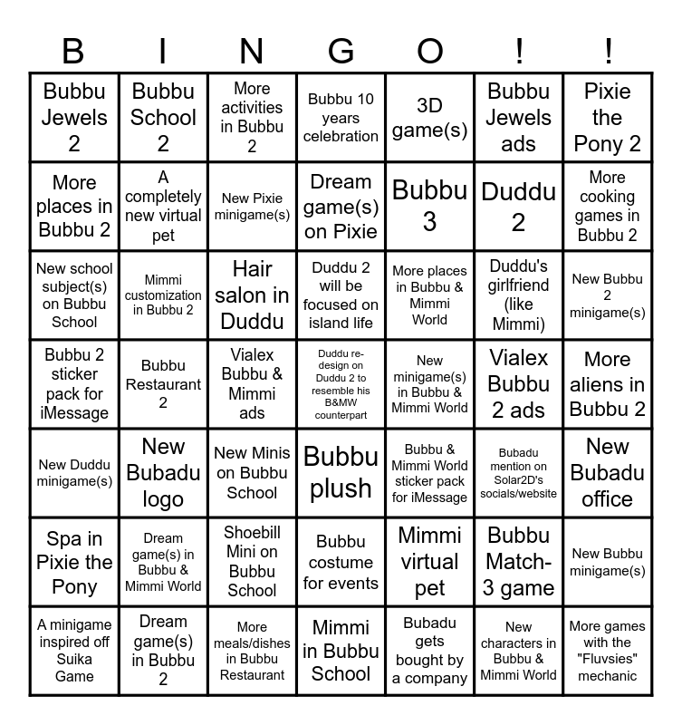 This bingo card has a free space and 48 words: Mimmi virtual pet, Duddu 2, Mimmi in Bubbu School, Bubbu Restaurant 2, Hair salon in Duddu, More aliens in Bubbu 2, Bubbu School 2, Dream game(s) in Bubbu 2, Bubbu Jewels ads, Bubbu plush, Pixie the Pony 2, Bubbu 10 years celebration, Duddu's girlfriend (like Mimmi), More places in Bubbu & Mimmi World, Spa in Pixie the Pony, Vialex Bubbu 2 ads, More places in Bubbu 2, More cooking games in Bubbu 2, Bubbu Match-3 game, 3D game(s), Bubbu 3, Vialex Bubbu & Mimmi ads, Bubbu Jewels 2, A completely new virtual pet, New Bubbu minigame(s), New Pixie minigame(s), New Bubbu 2 minigame(s), A minigame inspired off Suika Game, Duddu 2 will be focused on island life, Mimmi customization in Bubbu 2, New characters in Bubbu & Mimmi World, New minigame(s) in Bubbu & Mimmi World, New Bubadu office, Dream game(s) in Bubbu & Mimmi World, Bubbu 2 sticker pack for iMessage, Bubbu & Mimmi World sticker pack for iMessage, Bubadu mention on Solar2D's socials/website, New school subject(s) on Bubbu School, New Minis on Bubbu School, Shoebill Mini on Bubbu School, New Duddu minigame(s), More games with the "Fluvsies" mechanic, More activities in Bubbu 2, More meals/dishes in Bubbu Restaurant, Dream game(s) on Pixie, Bubbu costume for events, New Bubadu logo and Bubadu gets bought by a company.