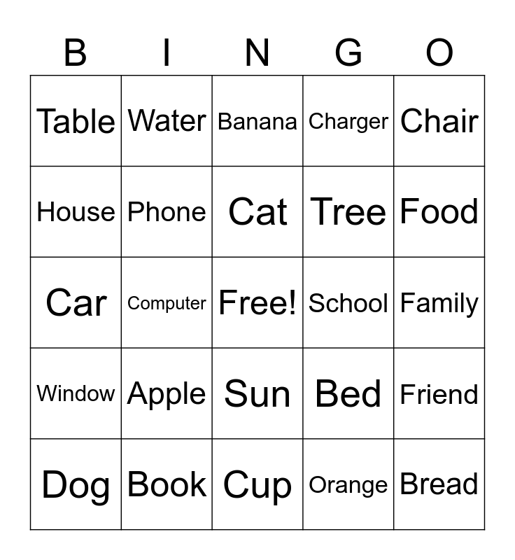 This bingo card has a free space and 24 words: Apple, Book, Cat, Dog, Chair, Table, House, Water, School, Sun, Tree, Car, Bed, Friend, Phone, Orange, Family, Banana, Food, Computer, Bread, Window, Charger and Cup.