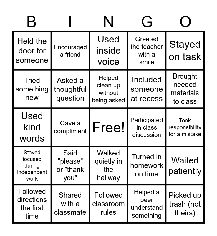 This bingo card has a free space and 24 words: Said "please" or "thank you", Shared with a classmate, Helped clean up without being asked, Followed directions the first time, Stayed on task, Held the door for someone, Tried something new, Encouraged a friend, Participated in class discussion, Walked quietly in the hallway, Included someone at recess, Used kind words, Turned in homework on time, Waited patiently, Asked a thoughtful question, Helped a peer understand something, Took responsibility for a mistake, Used inside voice, Brought needed materials to class, Gave a compliment, Picked up trash (not theirs), Stayed focused during independent work, Greeted the teacher with a smile and Followed classroom rules.