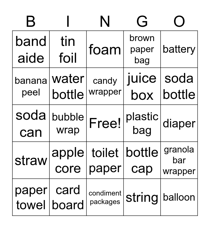 This bingo card has a free space and 24 words: apple core, card board, candy wrapper, paper towel, battery, band aide, banana peel, tin foil, plastic bag, toilet paper, juice box, soda can, bottle cap, granola bar wrapper, water bottle, string, diaper, foam, soda bottle, bubble wrap, balloon, straw, brown paper bag and condiment packages.