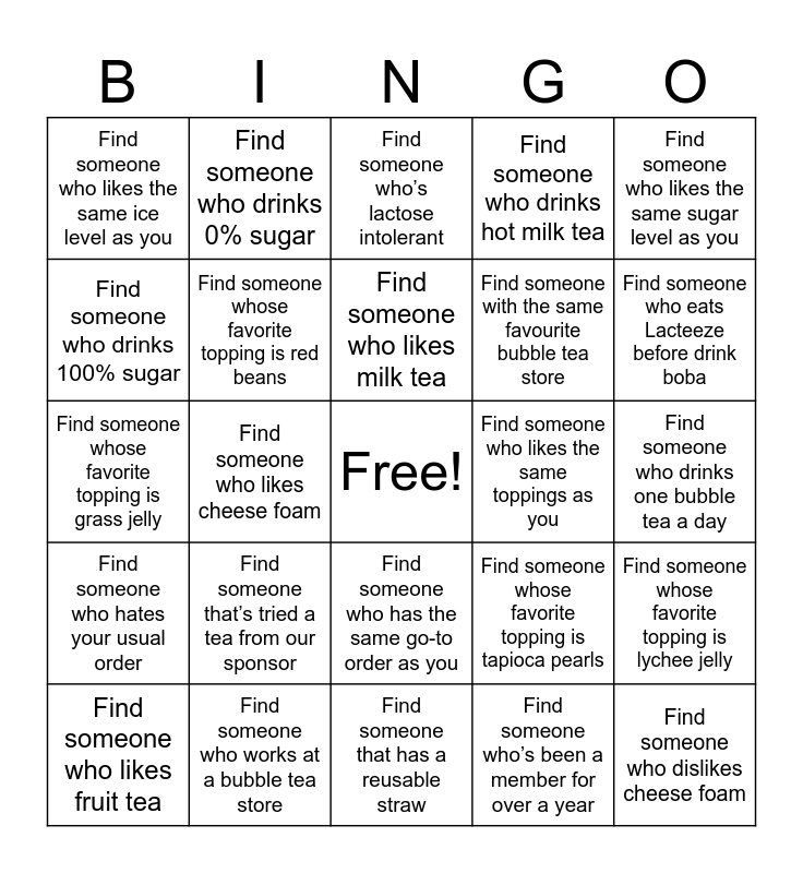 This bingo card has a free space and 25 words: Find someone that’s tried a tea from our sponsor, Find someone that has a reusable straw, Find someone who likes milk tea, Find someone who likes fruit tea, Find someone who likes the same sugar level as you, Find someone who likes the same ice level as you, Find someone who drinks 100% sugar, Find someone who drinks 0% sugar, Find someone who likes the same toppings as you, Find someone who has the same go-to order as you, Find someone with the same favourite bubble tea store, Find someone whose favorite topping is grass jelly, Find someone whose favorite topping is tapioca pearls, Find someone whose favorite topping is lychee jelly, Find someone whose favorite topping is red beans, Find someone who’s tried a bubble tea that’s not available in Australia, Find someone who drinks one bubble tea a day, Find someone who’s lactose intolerant, Find someone who eats Lacteeze before drink boba, Find someone who likes cheese foam, Find someone who dislikes cheese foam, Find someone who works at a bubble tea store, Find someone who hates your usual order, Find someone who drinks hot milk tea and Find someone who’s been a member for over a year.