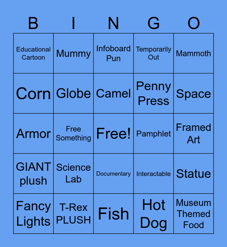 This bingo card has a free space and 24 words: Science Lab, T-Rex PLUSH, Camel, Fancy Lights, Mammoth, Educational Cartoon, Corn, Mummy, Pamphlet, Documentary, Penny Press, Armor, Interactable, Statue, Globe, Hot Dog, Framed Art, Infoboard Pun, Space, Free Something, Museum Themed Food, GIANT plush, Temporarily Out and Fish.