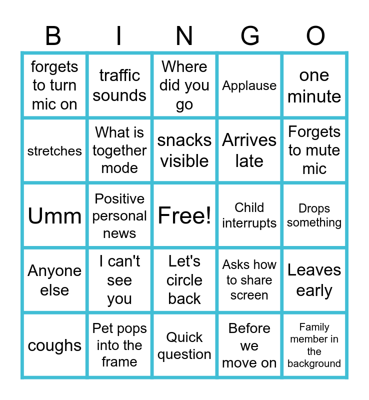 This bingo card has a free space and 24 words: I can't see you, Pet pops into the frame, snacks visible, coughs, one minute, forgets to turn mic on, stretches, traffic sounds, Child interrupts, Let's circle back, Arrives late, Umm, Asks how to share screen, Leaves early, What is together mode, Before we move on, Drops something, Where did you go, Forgets to mute mic, Positive personal news, Family member in the background, Anyone else, Applause and Quick question.