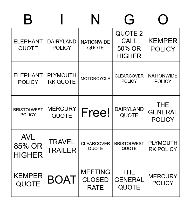 This bingo card has a free space and 24 words: TRAVEL TRAILER, BOAT, MOTORCYCLE, KEMPER QUOTE, KEMPER POLICY, ELEPHANT QUOTE, ELEPHANT POLICY, DAIRYLAND POLICY, DAIRYLAND QUOTE, CLEARCOVER QUOTE, CLEARCOVER POLICY, BRISTOLWEST POLICY, BRISTOLWEST QUOTE, PLYMOUTH RK POLICY, PLYMOUTH RK QUOTE, THE GENERAL QUOTE, THE GENERAL POLICY, NATIONWIDE QUOTE, NATIONWIDE POLICY, MERCURY QUOTE, MERCURY POLICY, AVL 85% OR HIGHER, QUOTE 2 CALL 50% OR HIGHER and MEETING CLOSED RATE.