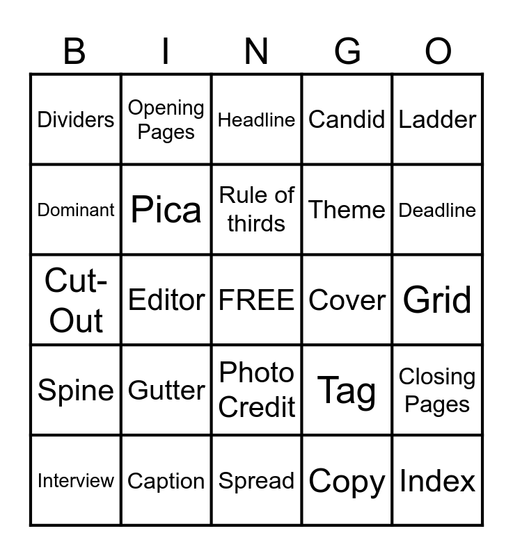 This bingo card has a free space and 29 words: Interview, White Space, Editor, Layout, Dividers, Headline, Pica, Gutter, Cover, Caption, Grid, Index, Spread, Copy, Deadline, Element, Photo Credit, Spine, Ladder, Cut-Out, Tag, Coverage, Theme, Dominant, Candid, Opening Pages, Closing Pages, Rule of thirds and Mugshots.