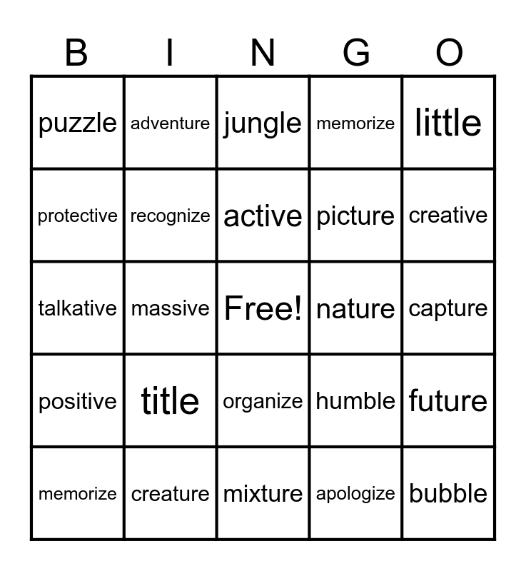 This bingo card has a free space and 24 words: title, creature, active, memorize, little, puzzle, protective, adventure, nature, organize, picture, talkative, humble, future, recognize, apologize, capture, jungle, creative, massive, bubble, positive, memorize and mixture.