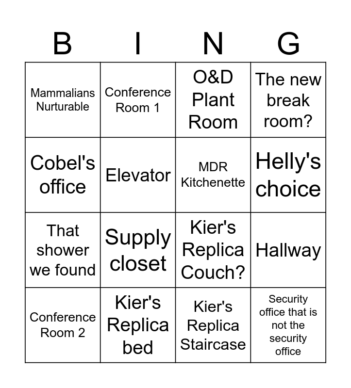 This bingo card has 16 words: Kier's Replica bed, Hallway, O&D Plant Room, Mammalians Nurturable, That shower we found, Conference Room 1, Kier's Replica Couch?, Kier's Replica Staircase, Cobel's office, Elevator, Conference Room 2, The new break room?, Supply closet, Helly's choice, MDR Kitchenette and Security office that is not the security office.