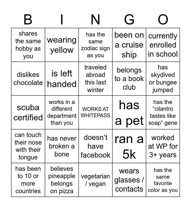 This bingo card has a free space and 29 words: has been to 10 or more countries, speaks more than one language, works in a different department than you, is from the same state as you, shares the same hobby as you, has the same zodiac sign as you, is left handed, has never broken a bone, has a pet, believes pineapple belongs on pizza, has the “cilantro tastes like soap” gene, has the same favorite color as you, vegetarian / vegan, wears glasses / contacts, has skydived or bungee jumped, plays an instrument, doesn’t have facebook, can touch their nose with their tongue, currently enrolled in school, scuba certified, ran a 5k, wears socks to bed, belongs to a book club, dislikes chocolate, been on a cruise ship, wearing yellow, worked at WP for 3+ years, traveled abroad this last winter and has made a new years resolution and kept it.