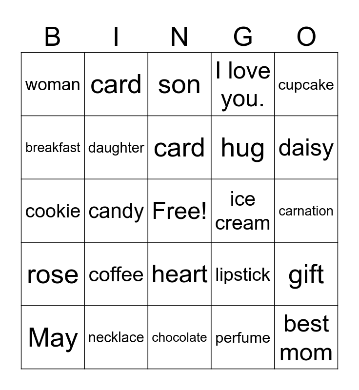 This bingo card has a free space and 24 words: coffee, necklace, card, May, cupcake, woman, breakfast, card, ice cream, heart, hug, cookie, lipstick, gift, daughter, perfume, carnation, son, daisy, candy, best mom, rose, I love you. and chocolate.