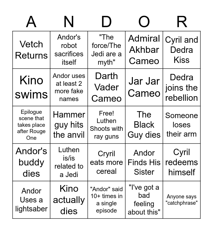 This bingo card has a free space and 24 words: Luthen is/is related to a Jedi, Kino actually dies, Darth Vader Cameo, Andor Uses a lightsaber, Cyril and Dedra Kiss, Vetch Returns, Kino swims, Andor's robot sacrifices itself, The Black Guy dies, Cryril eats more cereal, Jar Jar Cameo, Epilogue scene that takes place after Rouge One, Andor Finds His Sister, Cyril redeems himself, Andor uses at least 2 more fake names, "I've got a bad feeling about this", Someone loses their arm, "The force/The Jedi are a myth", Dedra joins the rebellion, Hammer guy hits the anvil, Anyone says "catchphrase", Andor's buddy dies, Admiral Akhbar Cameo and "Andor" said 10+ times in a single episode.