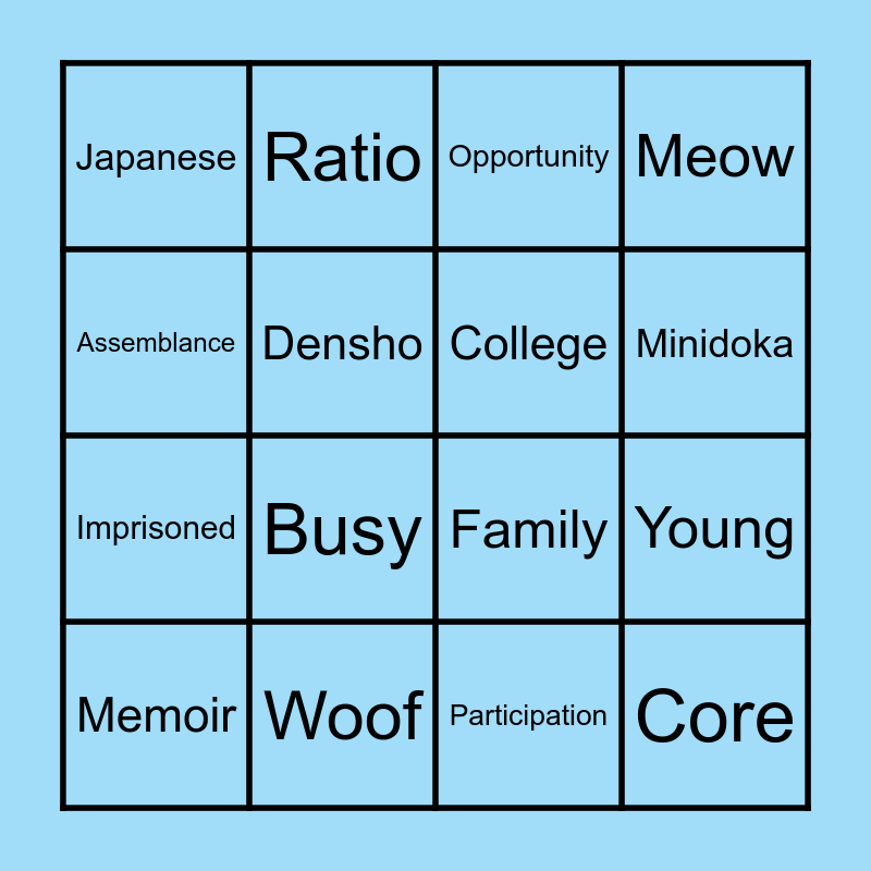 This bingo card has 22 words: Woof, Camps, Ratio, Musical, Densho, College, Japanese, Opportunity, Family, Core, Imprisoned, Meow, Play, Class, Participation, School, Young, Memoir, Busy, Assemblance, Minidoka and Baseball.