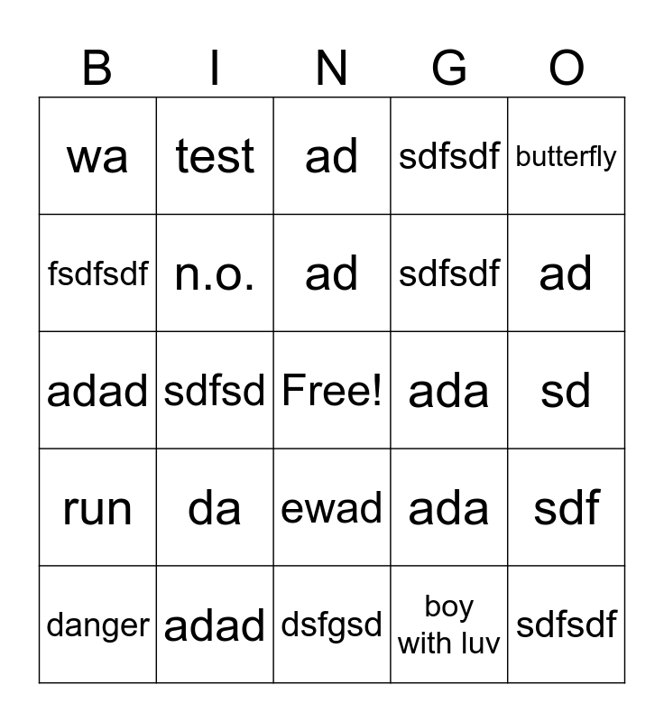 This bingo card has a free space and 34 words: spring day, boy with luv, boy in luv, run bts, run, n.o., butterfly, danger, test, etsa, ad, ad, adasda, sdad, ada, ad, adad, adad, da, ada, ewad, w, wa, sd, dsfgsd, sdfsdf, sdfsdf, sdfsdf, sdfsdf, fsdfsdf, fddsf, sdfsd, sdf and sdffsd.