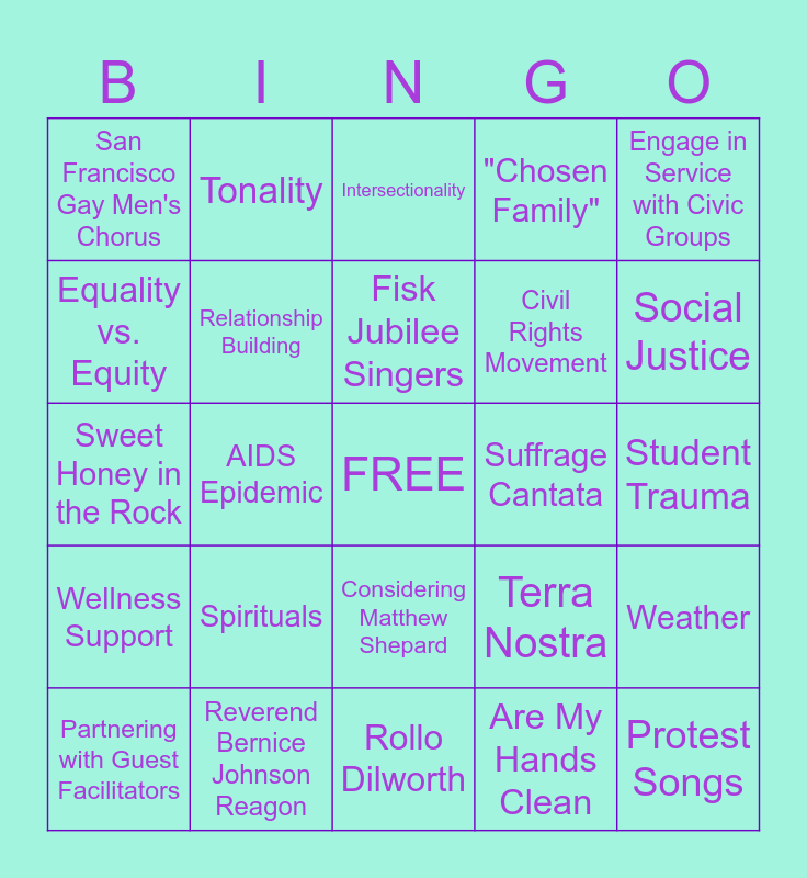 This bingo card has a free space and 28 words: Weather, Dialoguing, Civil Rights Movement, Are My Hands Clean, Equality vs. Equity, Intersectionality, Tonality, Wellness Support, Suffrage Cantata, Partnering with Guest Facilitators, Sweet Honey in the Rock, "Chosen Family", Reverend Bernice Johnson Reagon, Rollo Dilworth, Social Justice, Gala Choruses, Spirituals, Relationship Building, Fisk Jubilee Singers, Considering Matthew Shepard, San Francisco Gay Men's Chorus, Choral Music for Social Justice, Protest Songs, AIDS Epidemic, Student Trauma, Terra Nostra, Engage in Service with Civic Groups and My Name is Lamiya: Don't Call Me Refugee.