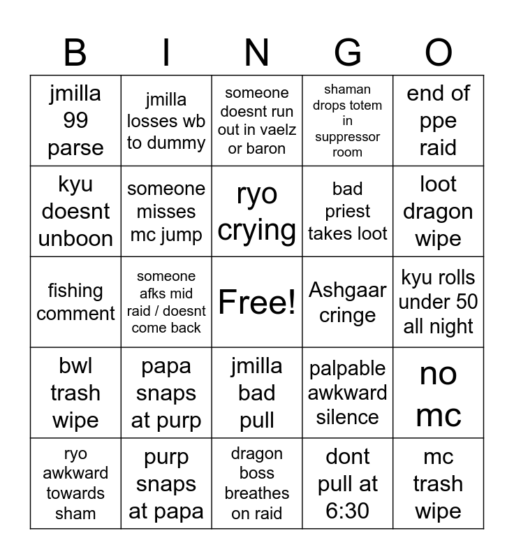 This bingo card has a free space and 24 words: papa snaps at purp, purp snaps at papa, ryo crying, ryo awkward towards sham, end of ppe raid, jmilla 99 parse, kyu doesnt unboon, jmilla losses wb to dummy, Ashgaar cringe, jmilla bad pull, bad priest takes loot, fishing comment, palpable awkward silence, no mc, someone misses mc jump, dont pull at 6:30, kyu rolls under 50 all night, someone doesnt run out in vaelz or baron, loot dragon wipe, someone afks mid raid / doesnt come back, mc trash wipe, bwl trash wipe, shaman drops totem in suppressor room and dragon boss breathes on raid.
