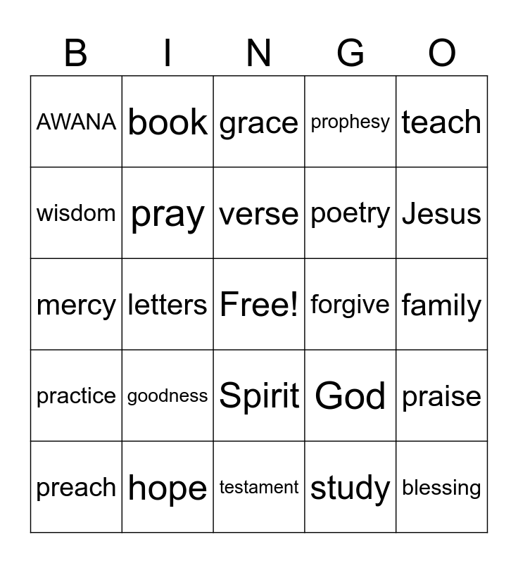 This bingo card has a free space and 34 words: Bible, study, meditate, listen, practice, pray, teach, preach, book, chapter, verse, grace, love, kindness, forgive, Jesus, hope, mercy, goodness, God, Spirit, truth, AWANA, family, testament, blessing, prophesy, history, poetry, wisdom, law, letters, praise and worship.