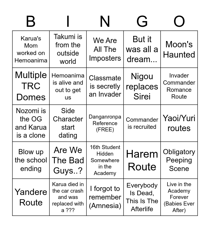This bingo card has a free space and 24 words: Are We The Bad Guys..?, Karua died in the car crash and was replaced with a ???, Classmate is secretly an Invader, Yandere Route, Moon's Haunted, Karua's Mom worked on Hemoanima, Multiple TRC Domes, Takumi is from the outside world, Commander is recruited, 16th Student Hidden Somewhere in the Academy, Nigou replaces Sirei, Nozomi is the OG and Karua is a clone, Harem Route, Obligatory Peeping Scene, Hemoanima is alive and out to get us, Everybody Is Dead, This Is The Afterlife, Yaoi/Yuri routes, We Are All The Imposters, Invader Commander Romance Route, Side Character start dating, Live in the Academy Forever (Babies Ever After), Blow up the school ending, But it was all a dream... and I forgot to remember (Amnesia).